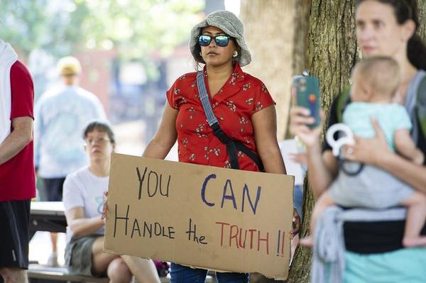 worth getting into an argument with them. | Law professor Sabrina Hassanali holds a sign at the Truth Walk in Decatur, IL, 6/11/2022, part of national Days of Action coordinated by the Zinn