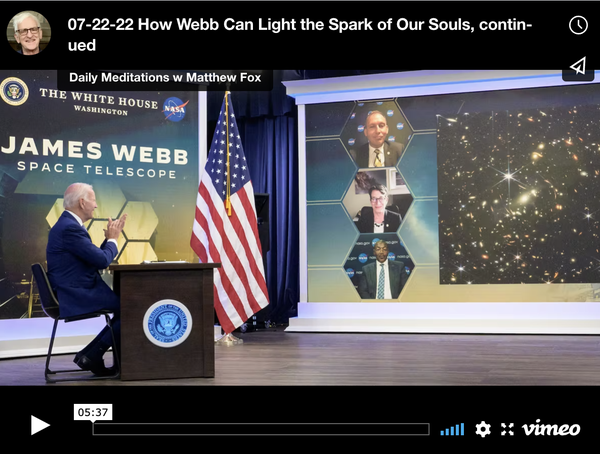 | To view today's video, please click the image. You will be taken to today's post on the Daily Meditations with Matthew Fox website, where you can see the meditation in a larger version and also view and post your Comments. In the sharing that follows, a kind of community is developing around the DM.