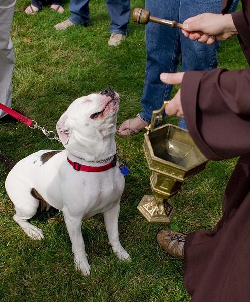 church for a blessing. Ministers have told me that very often more people come to church on that day than any other day in the year! I once attended such an event at St. John’s Episcopal Cathedral in New York City (Thomas Berry preached) and the array of animals that paraded with their keepers down the aisle was memorable—ranging | A pit bull enjoys being sprinkled with holy water at the Blessing of the Animals, Siena College, 2009. Wikimedia Commons. |