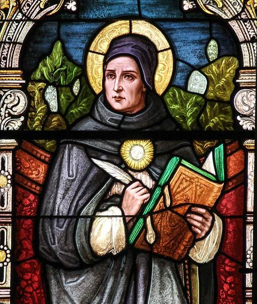 Thomas Aquinas. Stained glass window in the Franciscan Monastery in Washington DC. Photo by Lawrence OP on Flickr. | Aquinas thinks the opposite—that history and multiplicity are “a work of