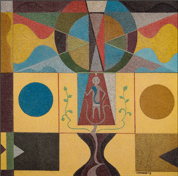Laney College in Oakland. He dedicates this work to Teilhard de Chardin: | “Emergence” Sand painting by David Paladin, 1973. Reprinted with permission. |