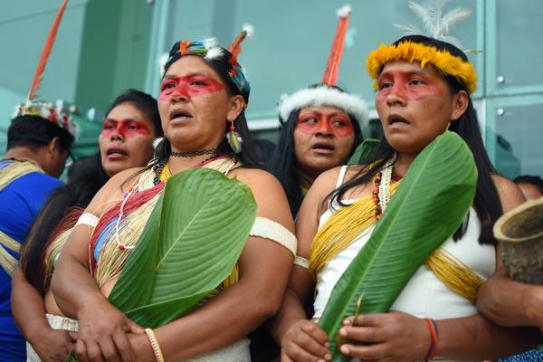 Waorani women, protesting ‘rushed’ hearing of their suit against the Ecuadoran government selling tribal land, shut down court with song. Photo by Sophie Pinchetti for Amazon Frontlines. Mongabay News. |