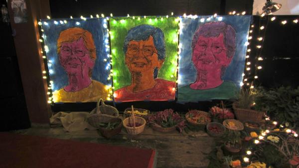 Readings and Meditations Banner Image: Triptych altar honoring Dorothy Stang. Images painted by her brother Tom Stang who brought the work to a Cosmic Mass. Photo contributed by Matthew Fox. |