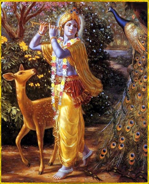 Me. Krishna is the source of light in all luminous objects. He is beyond the darkness of matter and is unmanifested He is knowledge. He is the object of knowledge, and he is the goal of knowledge. He is situated in everyone’s heart. | The Hindu deity Krishna, portrayed as a blue man, is seen as an embodiment of infinite creativity and compassion; blue being an expression of