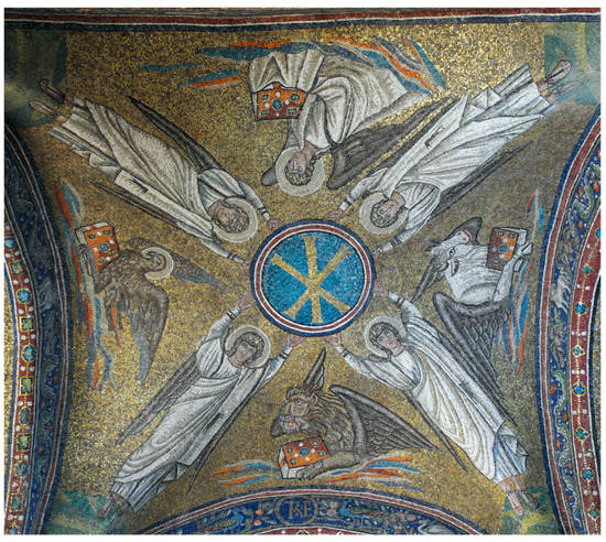 “cosmic | The monogram of Christ surrounded by four archangels, mosaic vault, Archiepiscopal Chapel, Ravenna, c. 500 C.E. (photo: GFreihalter, Wikimedia Commons, CC BY-SA 3.0, cropped). |