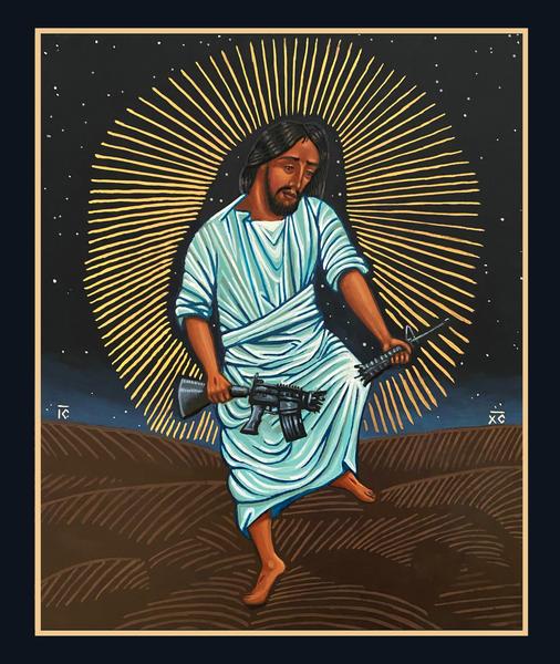 “Christ Breaks the Rifle.” Image by iconographer Kelly Latimore. Purchase HERE. | Merton does so when he says: We are other Christs…In us, the image of God, which is complete and entire in each individual soul, is also in all of us ‘the image of God.’ Moxa is a word I have invented from the word