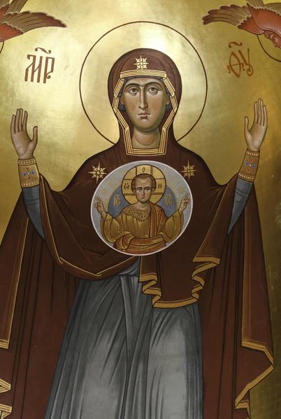 prince of peace? When do we birth the rabbi who teaches that God is ”Emmanuel” or God-with-us is also the Compassionate One and that we are capable of “being compassionate like God who is compassionate”? (See Luke 6.36) In the Jewish tradition, compassion is “the secret name for God” and Jesus let that secret out of the bag in a | “Theotokos – God-Bearer” Icon in the apse of the Orthodox Cathedral of St Nicholas, Washington DC. Photo by Lawrence OP on Flickr. |