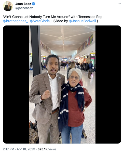 Joan Baez sings “Ain’t Gonna Let Nobody Turn Me Around” with Tennessee Rep. Justin Jones (video by @JoshuaBodwell) To hear them sing, click on the image. | This seems like a prescient naming of the