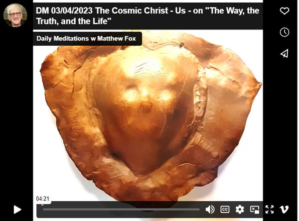 | To view today's video, please click the image. You will be taken to today's post on the Daily Meditations with Matthew Fox website, where you can see the meditation in a larger version and also view and post your Comments. In the sharing that follows, a kind of community is developing around the DM. If you can't reach today's post on the website directly, click HERE. If you can't reach Matthew's video on the website, try his Vimeo channel HERE. |