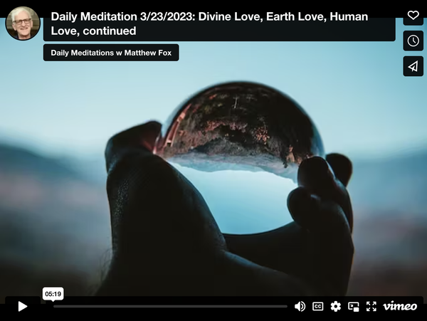 | To view today's video, please click the image. You will be taken to today's post on the Daily Meditations with Matthew Fox website, where you can see the meditation in a larger version and also view and post your Comments. In the sharing that follows, a kind of community is developing around the DM. If you can't reach today's post on the website directly, click HERE. If you can't reach Matthew's video on the website, try his Vimeo channel HERE. |