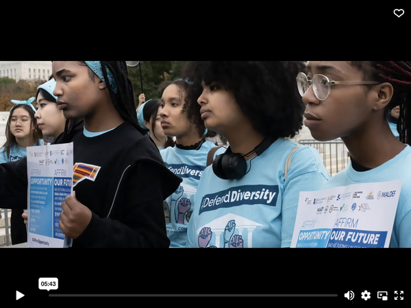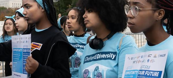 Banner Image: Defend Diversity students outside the Supreme Court as affirmative action cases argued inside –