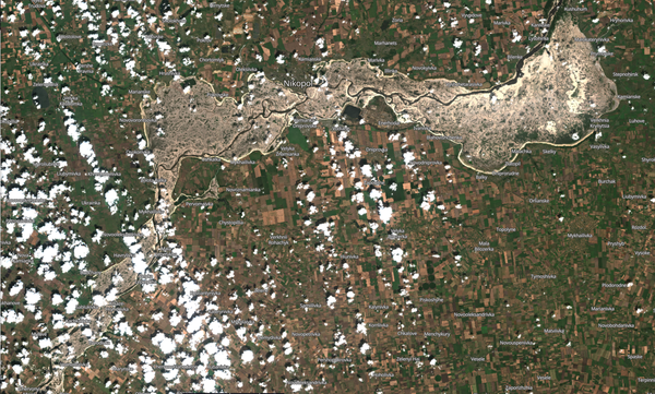 causing the biggest environmental catastrophe in Ukraine since the 1986 Chernobyl disaster: 24 villages flooded, 58 humans dead, along with tens of thousands of farm animals and tons of fish, as well as innumerable wildlife. Sentinel-2 L2A satellite image taken on 15 July, 2023. Wikimedia Commons. |
