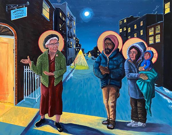 about giving without a guaranteed return; it is | “Dorothy Day and the Holy Family of the Streets.” Painting by iconographer Kelly Latimore. Published with permission; to purchase,