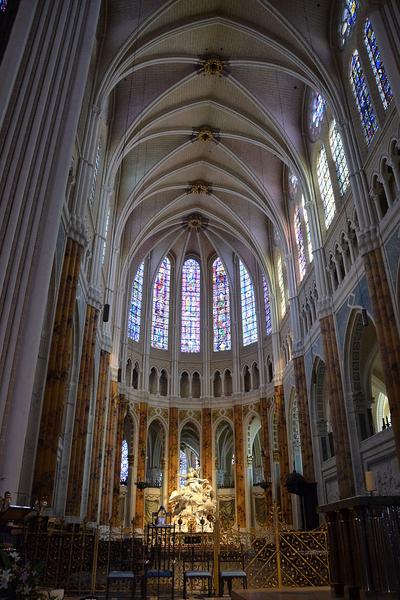 A symphony of light: stained glass windows and flying buttresses at Chartres Cathedral. Photo by Marianne Casamance on Wikimedia Commons. | The movement from Romanesque architecture—thick walls, small windows, squat buildings with defense as its motif (defense from marauders