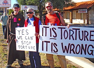 "Louis Vitale, Megan Rice, Jim Haber at Ft. Huachuca, Arizona, 2008" protesting the use of torture. Wikimedia