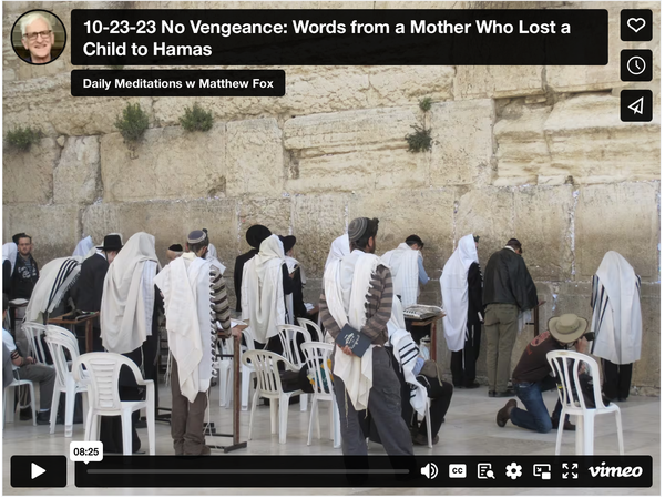 I invite you to partake of the moving YouTube video in this daily meditation from Michal Halev, mother of a young man slain by the Hamas invasion of Israel. It is called “No vengeance in my name - the call of Michal