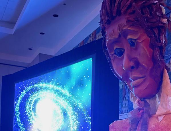 projected galaxy image at the Cosmic Mass, 2023 Parliament of World Religions. Puppet and photo by Mary Plaster. Published with permission. |