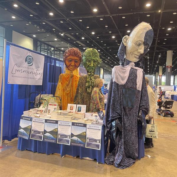 Giant puppets of Fire, Earth, and the Moon, by Mary Plaster, oversee the Creation Spirituality Communities booth at the Photo by Mary Plaster, published with