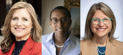 Banner Image: Former university presidents Mary Elizabeth Magill (University of Pennsylvania) and Claudine Gay (Harvard), and embattled current MIT president Sally Kornbluth. Portraits from the bio pages of their respective universities. |