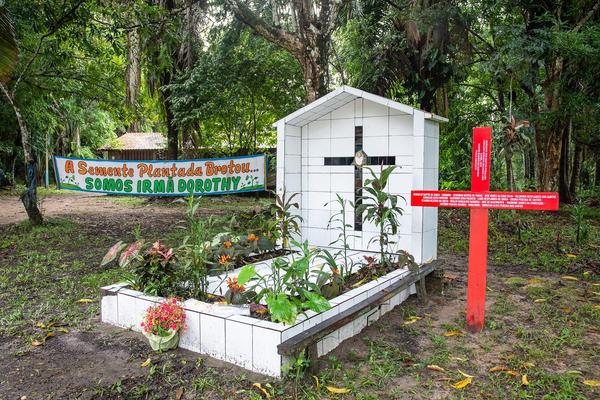Banner Image: “The seed planted sprouted/ We are Sister Dorothy.” Banner and cross beside Sister Dorothy’s tomb at the São Rafael Training Center. Photo by Amazônia Real on