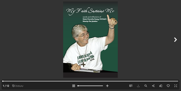 My Faith Sustains Me, the recorded words and reflections of Sister Dorothy Stang in a flipbook on Issuu. Click the photo to open. | In the Introduction we are told that the night before her death she brought food and clothing to a family whose home had been burned to the ground. She worked for 31 years among the poor in the Amazon and “her |