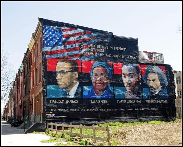 Mural by Parris Stancell, Philadelphia, sponsored by the Freedom School Mural Arts Program. Left to right; Malcolm Shabazz (Malcolm X), Ella Baker, Martin Luther King, Frederick Douglass. Photo by Tony Fischer, on Flickr. |