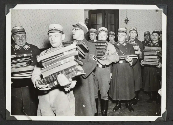 Jewish books being carried away by Nazis, presumably for burning. Anonymous photo from 1938. Wikimedia