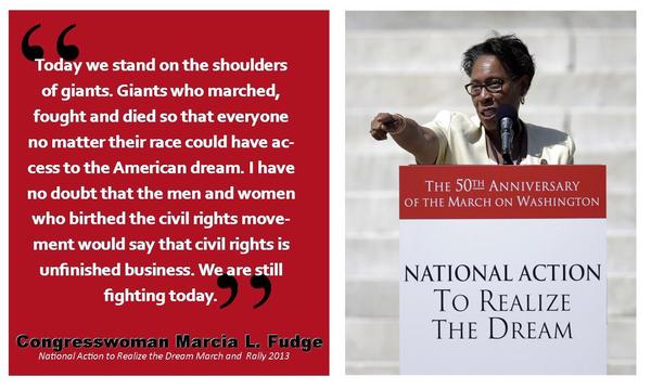 Congresswoman Marcia Fudge of Ohio speaks at the 50th Anniversary (2013) of MLK Jr.’s March on Washington (1963). Photo by Marcia Fudge. Wikimedia Commons. |