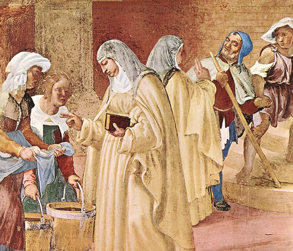 And Fox, Meditations with Meister Eckhart, pp. 76-84. Banner Image: "Blessings of St. Brigid." A 16th-century fresco by Lorenzo Lotto in the Suardi Chapel showing Brigid turning water into beer (left) and healing a blind man (right). Wikimedia Commons |