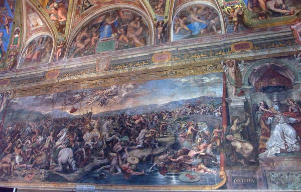 “The Battle of Milvian Bridge,” before which Constantine had a vision promising victory if the sign of the Chi Rho, the first two letters of Christ’s name in Greek, was painted on the soldiers’ shields. Fresco by Giulio Romano (1520), in the Apostolic Palace of the Vatican. Photo by Jean-Christophe Benoist, Wikimedia Commons. |