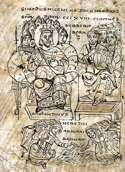 Emperor Constantine and the Council of Nicaea; the burning of Arian books. From MS CLXV, Biblioteca Capitolare, Vercelli, ca. 825. Wikimedia Commons. |