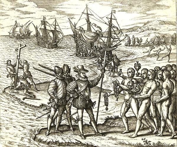 “Columbus Landing on Hispaniola.” In Great Journeys, America, part 4. Intaglio engraving by Théodore de Bry, 1594. Wikimedia Commons. |