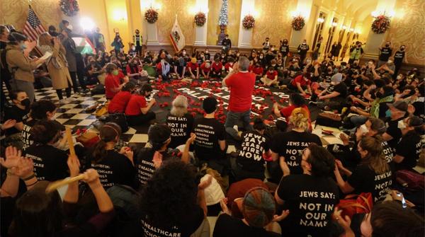 Banner Image: “Not In Our Name”: Led by Jewish groups, hundreds of Jews and allies came together at the California State Capital to call on legislators to support an immediate and permanent ceasefire in Gaza and to stop the US funding of genocide. Photo by Peg Hunter on Flickr. |