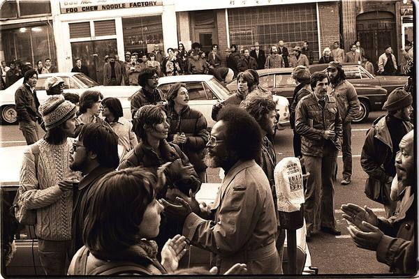 Banner Image: Reverend Cecil Williams (center front) at an anti-eviction rally, January 1977, to save the International Hotel at 848 Kearny Street in San Francisco. Photo by Nancy Wong on Wikimedia Commons. |