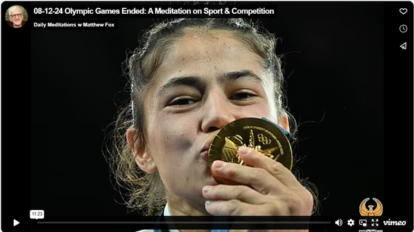See Matthew Fox, Whee! We, Wee All the Way Home: Toward a Sensual, Prophetic Spirituality And Fox, Original Blessing: A Primer in Creation Spirituality And Fox, Creativity: Where the Divine and the Human Meet Banner image: “Diyora Keldiyorova at the 2024 Summer Olympics” kissing her medal. Wikimedia Commons.