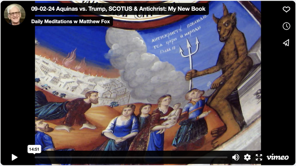 Adapted from Matthew Fox, Trump & MAGA as Antichrist: A Handbook for the 2024 Election, p. ix. See Fox, Sins of the Spirit, Blessings of the Flesh: Transforming Evil in Soul and Society. And Fox, Original Blessing: A Primer in Creation Spirituality. Banner image: A fresco of the Antichrist in the Osogovo Monastery, Republic of Macedonia. Photo by Edal Anton Lefterov. Wikimedia Commons.