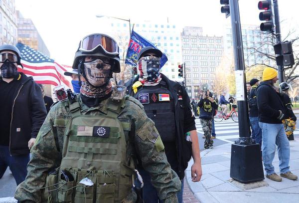 Flags, flak vests, and death’s-head mask: Proud Boys march for the First Felon, Washington, DC, 2020. Photo by Elvert Barnes is licensed under CC BY-SA 2.0. | Hildegard presents an exaggerated and aggressive penis in the institution, which signifies the toxic masculine of a one-sided and dominating patriarchy. Since the reptilian brain operates our sexuality, she is picturing the reptilian brain at work. Fascism is born of the |