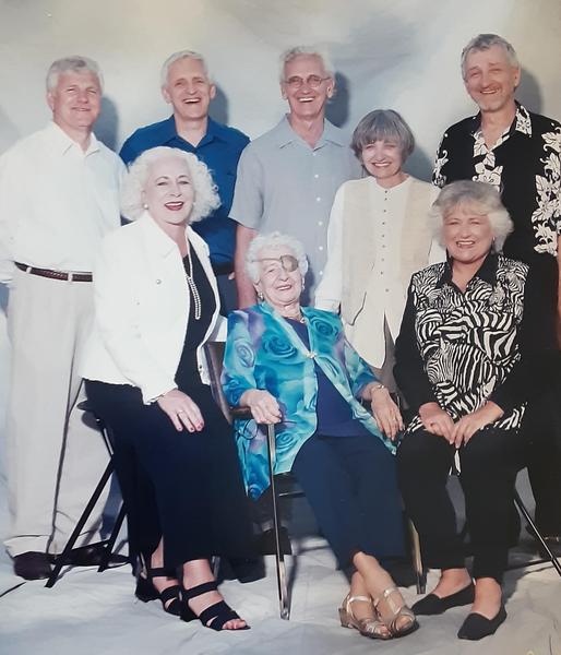 Beatrice Fox with her grown children, c. 1990. Standing, L-R: Mike, Tim (Matt), Tom, Terry, Nat. Sitting, L-R: Tricia, Beatrice, Roberta. From Matthew Fox's personal collection. | Friendship meant a lot to my mother. She belonged to a book club, sewing club, bridge club, etc. and had friends of many diverse interests and backgrounds. It was she who proposed that we rent out a room in our home for a foreign