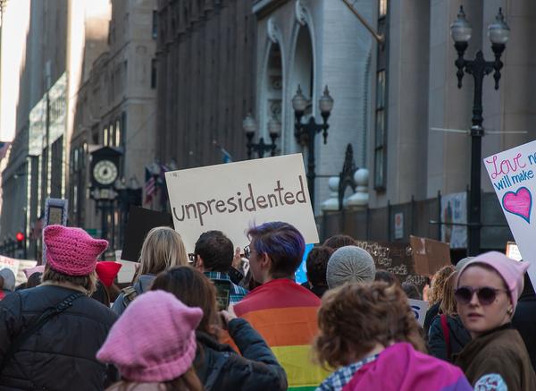 The day after Trump’s inauguration, people were already punning on how “unprecedented” his regime would be. Photo from the Women’s March in Chicago by bradhoc, January 21, 2017. Wikimedia Commons. |