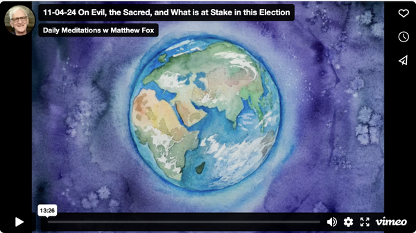 | To view today's video, please click the image. You will be taken to today's post on the Daily Meditations with Matthew Fox website, where you can see the meditation in a larger version and also view and post your Comments. In the sharing that follows, a kind of community is developing around the DM. If you can't reach today's post on the website directly, click HERE. If you can't reach Matthew's video on the website, try his Vimeo channel HERE. |