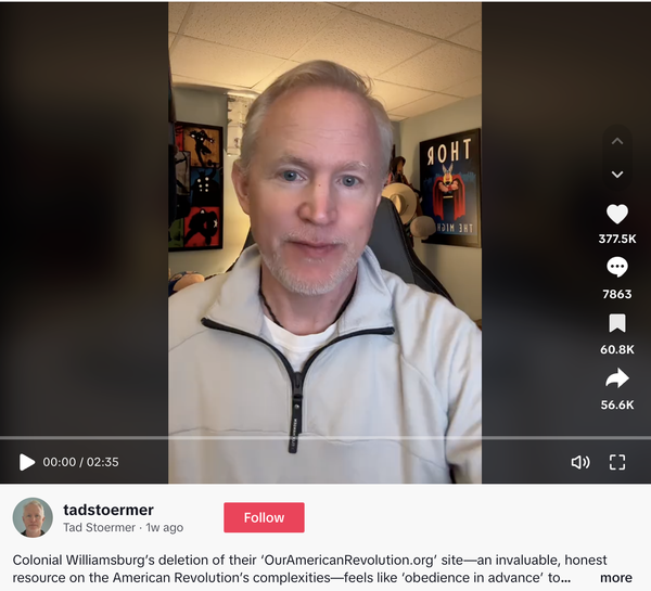 Obedience in advance: Johns Hopkins historian Tad Stoermer tells of finding the Colonial Williamsburg website's in-depth historical account, including slavery and indigenous encounters, deleted in advance of a T**** administration. TikTok