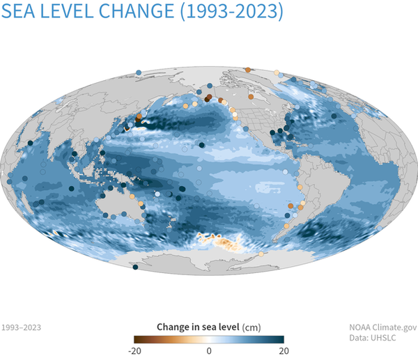 Between 1993 and 2023 mean sea level has risen across most of the world oceans. Coastal sea level rates (dots) can be larger due to ground settling or smaller due to ground rebound after ice-age glacier melt. NOAA Climate.gov map. |