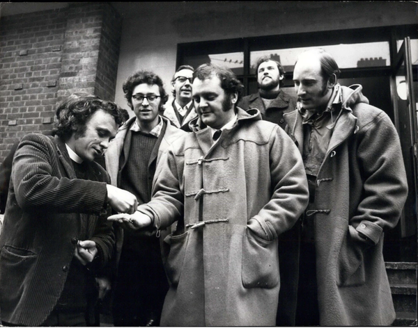 Reeves, at left, hands 50 pence to clergymen for two days of living on the streets of London in January 1973—part of the Urban Ministry Project. Photo by Alamy for The Telegraph’s obituary of Reeves. |