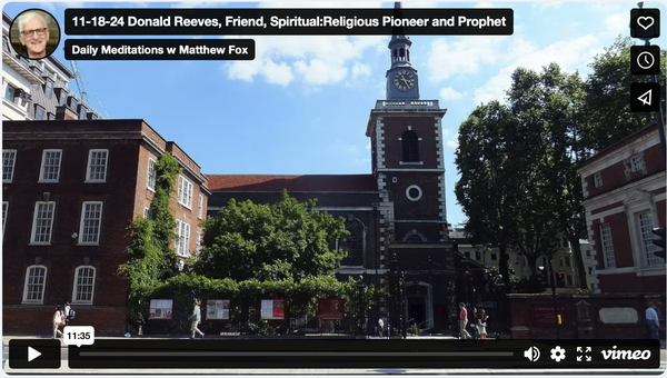 | To view today's video, please click the image. You will be taken to today's post on the Daily Meditations with Matthew Fox website, where you can see the meditation in a larger version and also view and post your Comments. In the sharing that follows, a kind of community is developing around the DM. If you can't reach today's post on the website directly, click HERE. If you can't reach Matthew's video on the website, try his Vimeo channel HERE. |