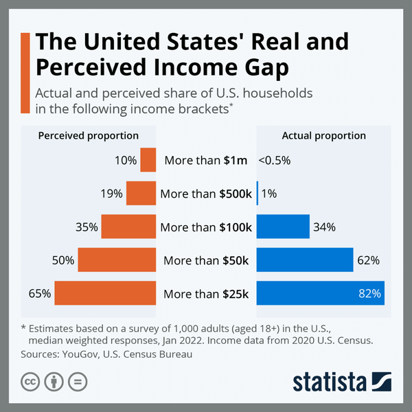 Comparison of actual vs. perceived percentage of U.S. households by income bracket during the initial regime of the First Felon. US Census Bureau 2020; infographic by Statista for World Economic Forum; CC BY-ND license. | Trump promised to reject Biden’s economic vision and resurrect the system of the years before 2021 in which a few individuals could amass as much wealth as possible. Just ten days after the election, a Texas judge overturned the Biden administration’s overtime pay rule, permitting employers to cancel the