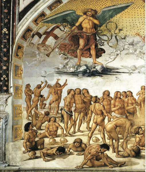 One of the full-color pictures that made the Anti-Christ book so difficult to print: Detail from The Resurrection of the Flesh (1502), a mural by Luca Signorelli in the Orvieto Cathedral. Wikimedia Commons. |
