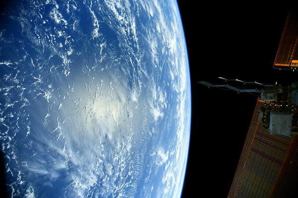 “Nice earth curvature, with the sun glint! Beautiful to see the reflection track us on the sea surface as we’re floating above…” Photo by ESA/NASA–T. Pesquet on Flickr. | Teilhard elaborates in another place. I give the