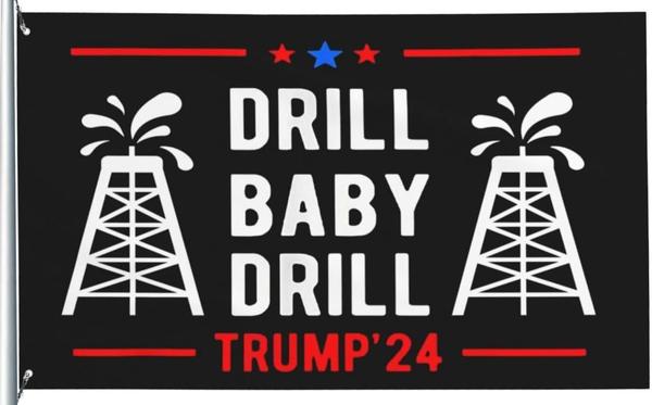 Banner Image: “Drill, Baby, Drill” flag promoting the First Felon’s campaign. On Amazon.com. |