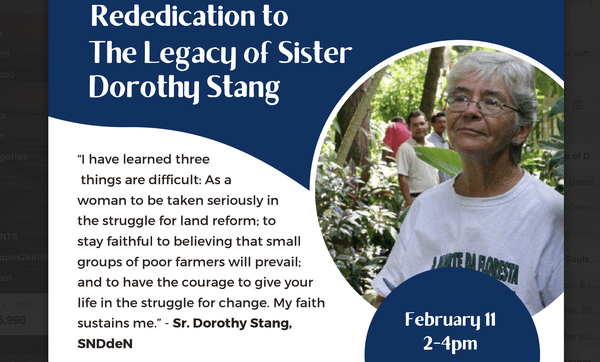 “Seeds of Inspiration: The Growing Legacy of Sister Dorothy Stang.” The Sisters of Notre Dame de Namur host a special panel presentation honoring Sister Dorothy’s life and continuing legacy. |