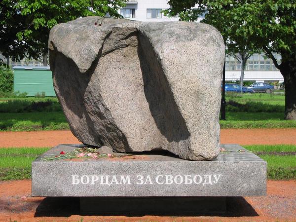 This monument is made of a boulder from the Solovetskiy penal colony—the first prison in the Gulag system. People gather here every year on the Day of Victims of the Repression (October 30). The caption means "For the fighters for freedom." Photo by Jennifer Boyer. Wikimedia Commons. |
